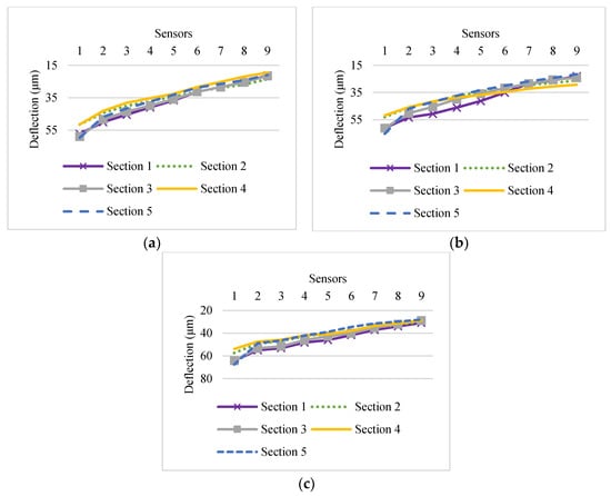 Deflection basin of each test. (a) The first test. (b) The second test. (c) The third test.