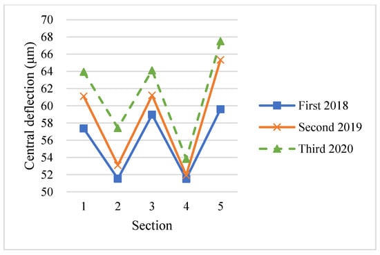 Each measuring point was hammered three times during the pavement surface deflection test. The first stroke is for trial and the average deflection value of the second and third strokes was used for analysis. There were 11 measuring points in each section when the length of the test section was 200 m, and the interval was 20 m. The average value of the 11 measuring points was taken to draw the deflection basin diagram, which is shown in Figure 4. The central deflection of the five sections in the three tests is shown in Figure 5.