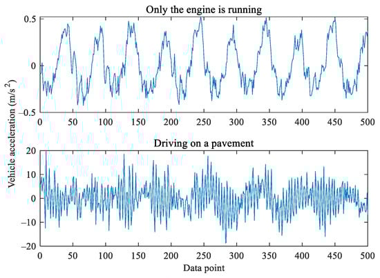 The vehicle acceleration mainly comes from the road excitation while driving, and the inertia force of the engine. The vehicle acceleration when only the engine was running and that when the vehicle was driving on a road pavement is shown in Figure 6. Figure 6 shows that the acceleration induced by the engine was quite small compared with that induced by the road. It also means that the placement of the vibration sensor was rational.