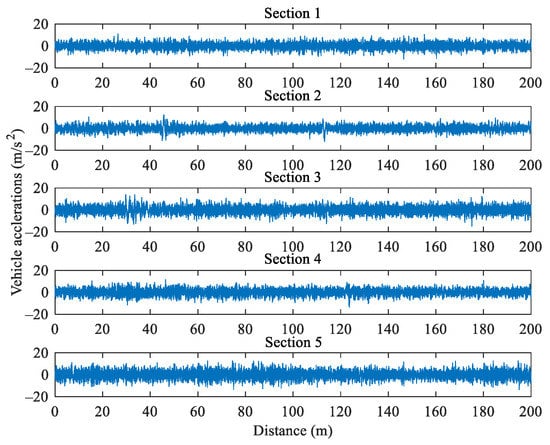 The time-domain waveforms of the first vehicle vibration test on the five sections are shown in Figure 7. It appears that the vehicle acceleration of Section 3 and Section 5 are relatively large. Apart from that, the difference in the vehicle acceleration in each section is not obvious, and further analysis is needed.