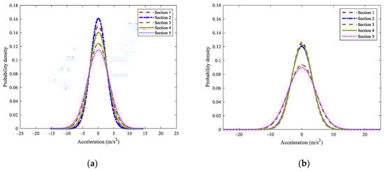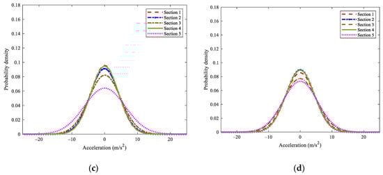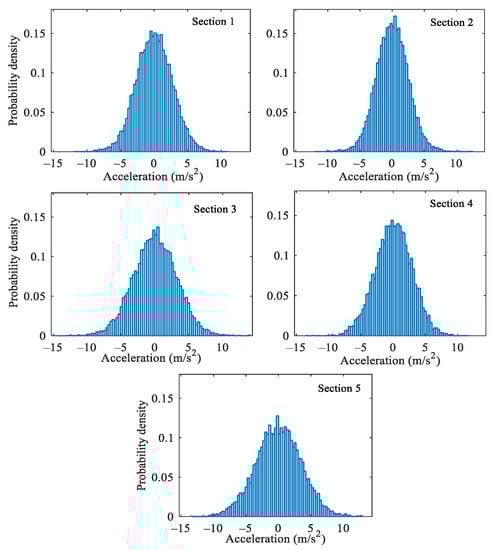 In order to make a statistical analysis of the vehicle vibration acceleration of 5 sections, the probability density distribution histogram of the acceleration at the first test is drawn in Figure 8. Through the Kolmogorov–Smirnov test, the vehicle acceleration data are found to be normally distributed since the p-value is larger than 0.05. The acceleration probability density fitting graphs of the four tests are drawn in Figure 9.