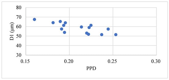 The Pearson correlation coefficient (r) between PPD and D1 is calculated to be −0.722. According to Table 4, there is a strong negative correlation between them. D1 is negatively correlated with pavement structural stiffness. Therefore, it can be concluded that a strong positive correlation exists between PPD and the pavement structural stiffness. The greater the PPD is, the higher the stiffness of the pavement structure is. The reason may be that the stronger pavement causes the vehicle to vibrate more frequently. Frequent vibrations will cause the vehicle acceleration to cross zero more frequently, which means that the probability of a vehicle acceleration value being zero is greater. When the abscissas are equally spaced, greater probability means higher probability density. This result preliminarily proves that the vehicle acceleration can reflect the pavement’s structural stiffness.