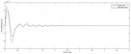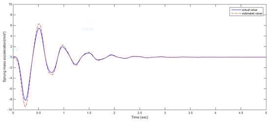 The results indicate that the proposed control methodology can robustly improve the ride comfort compared with passive FTC methods. The tire deflection and sprung mass acceleration responses together with their estimated values are plotted in Figure 2 and Figure 3, respectively. The results in Figure 2 show that the tire deflection response has been considerably reduced despite the fact that the system is subject to real-time sensor faults and disturbances. The same comment can be made about the sprung mass acceleration results shown in Figure 3. In addition, the vertical acceleration of the vehicle’s vibration, presented in Figure 3, is rapidly reduced by the fault-tolerant predictive control strategy while the actual value has been quickly and accurately estimated. As a result, the system may achieve lower values of body acceleration over time for the proposed active controller, which is better than the passive suspension systems proposed in [] and, as a consequence, this will ensure better ride comfort.
