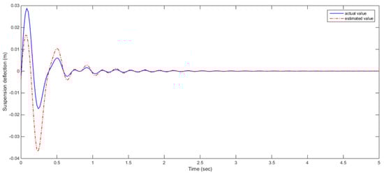 Figure 4 illustrates the suspension deflection, which is bounded by a maximum value of 0.04 m, where the system achieves lower values over time for the closed-loop systems. In addition, the proposed methodology has reasonably estimated the suspension deflection values, and the values have never exceeded the maximum value, which is better than the results presented in [].