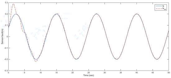 In this work, a LMI control toolbox in the MATLAB environment was used to solve the optimization problem in Equations (30)–(34). The results of the system states and their estimates and the fault with its estimate are illustrated in Figure 2, Figure 3, Figure 4, Figure 5 and Figure 6, respectively.