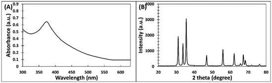 Figure 1. (A) UV–visible absorption spectrum of ZnO-NPs synthesized using P. zeylanica extract. (B) X-ray diffraction pattern of ZnO-NPs.