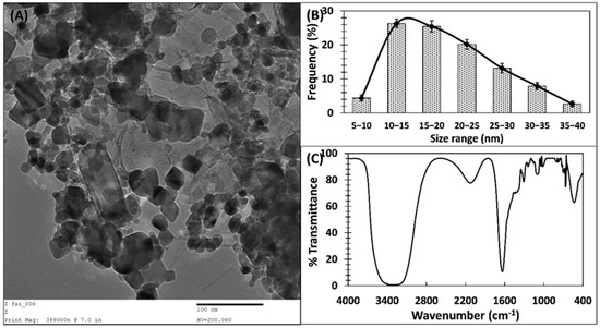 Figure 2. (A) Transmission electron micrograph of ZnO−NPs. (B) Particle size distribution histogram of ZnO−NPs. (C) Fourier-transform infrared spectrum of ZnO−NPs.