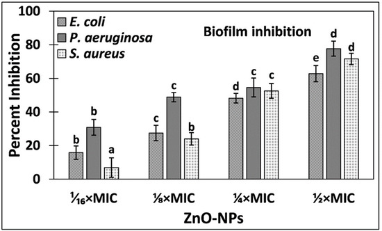 Figure 3. Inhibition of biofilm formation of E. coli, P. aeruginosa, and S. aureus by ZnO-NPs. Data is presented as average of three replicates and error bar is standard deviation. One-way ANOVA was performed using Tukey test at significance level of 0.05. Different letters in treatment groups represent different significance groups at p-value = 0.05 and are in ascending/descending order of values starting from the letter “a”.