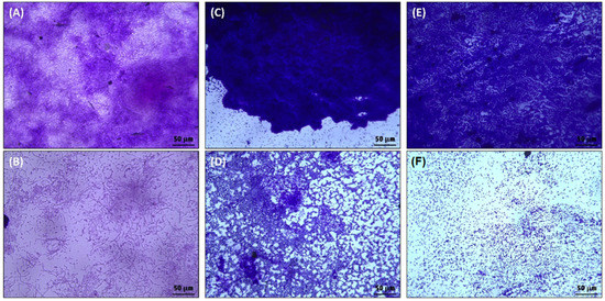 Figure 4. Light microscopic images of the E. coli, P. aeruginosa, and S. aureus biofilms in the absence and presence of ZnO-NPs. (A) untreated control E. coli; (B) E. coli treated with ½ × MIC of ZnO-NPs; (C) untreated control P. aeruginosa; (D) P. aeruginosa treated with ½ × MIC of ZnO-NPs; (E) untreated control S. aureus; (F) S. aureus treated with ½ × MIC of ZnO-NPs.