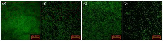 The confocal microscopic images of biofilms in the absence and presence of ZnO-NPs are shown in Figure 5. In control slides, all tested bacteria were found to be greatly colonized on the surface of glass coverslips. The bacteria were observed as thick mat-like structures of biofilms in many layers. On the contrary, ZnO-NPs reduced the bacterial biofilm development of solid support in which their colonization was extensively diminished. The bacteria in the treated group were found to be in scattered form and mostly as a single layer of cells on the surface of glass coverslips. These results agree with previous findings, where zinc oxide–xanthan gum nanocomposites reduced the biofilms formation of C. violaceum and S. marcescens as observed under confocal microscope [37].