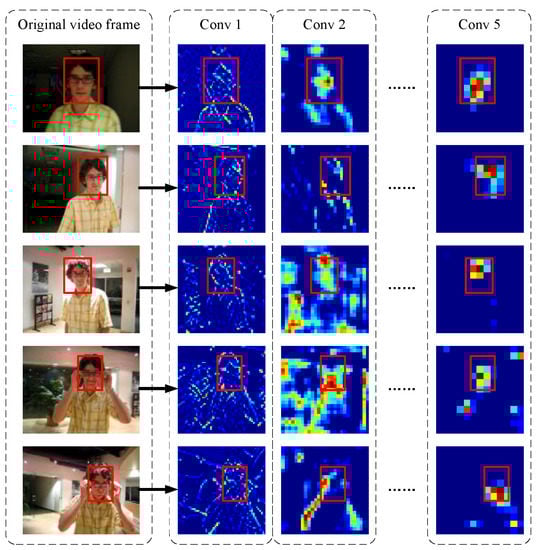 Usually, the convolutional neural networks have multiple convolutional layers, and each convolutional layer has multiple convolution kernels. Therefore, analyzing the response of each convolutional layer and convolution kernel can provide useful information for improving the object tracking method. First, in this work, we regard each frame in the video as an independent static image. After the image is passed through the convolutional neural network, a series of convolutional feature maps are formed. Based on the different levels of convolution feature extraction, those features are divided into low-level convolution features, middle-level convolution features, and high-level convolution features. In other words, the feature maps of different levels denote different levels of information extracted from the input image. For simplicity, in this work, we choose AlexNet in the SiameseFC tracking method to extract the convolutional features of each convolutional layer from the image. Then, we obtain the response of the object based on cross-matching, as shown in Figure 1. Since there are many channels in the high-level convolution features, only some typical features are extracted in order to highlight the key points.