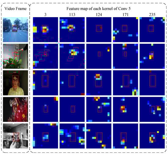 In order to verify these hypotheses, we use the “blurcar1”, “coke”, “david”, “soccer”, and “toy” video sequences in the benchmark set to perform experiments. The response of each object for different convolution kernels in the Conv5 convolution layer is shown in Figure 2.
