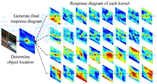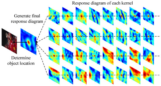 where and represent the object image and the search area image, respectively, denotes the convolution feature of the object image, denotes the convolution feature of the search area image, and represents the correlation operation. Essentially, the correlation operation of the multi-kernel convolution feature is the superposition of the correlation operation of each convolution kernel feature. Assuming that there are convolution kernels, then: