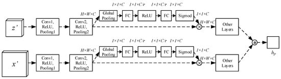 is a weighting process for , where represents the parameters used in the weighting process. These parameters are obtained automatically during end-to-end training of the deep learning network. When embedding the SE attention module in the Siamese network, we use ReLU and a fully connected layer to realize . Each convolution kernel uses the scalar to multiply the original convolution feature to achieve the weighting of the feature. The output weighted convolutional layer features are denoted by . The core of the SE attention module lies in the acquisition of the weighted parameter . Under normal circumstances, the SE attention module should be combined and synchronized with the backbone network for training. The network architecture after embedding the SE attention module in the Siamese network object tracking framework is shown in Figure 6.