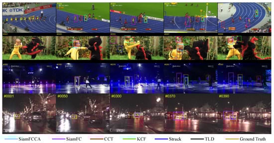 Qualitative comparison between SiamFCCA and other tracking methods.