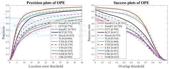 The precision and success plots of the proposed SiamFCCA and other tracking methods on all sequences.