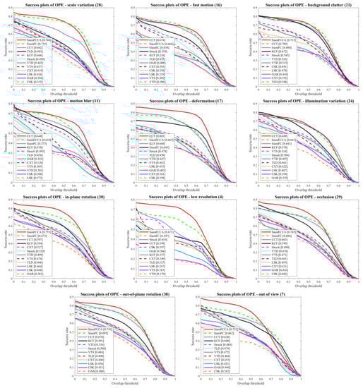 Figure 12 shows that the overall performance of the proposed SiamFCCA on the OTB benchmark set is better compared with the improved SiamFC. Its accuracy and success rate are 6.8% and 7.1% better compared with SiamFC, respectively. In order to further compare the performance of each tracking method in each sub-category of the OTB benchmark set, we estimate the precision data and success plots of each sub-category, as shown in Table 2 and Figure 13.