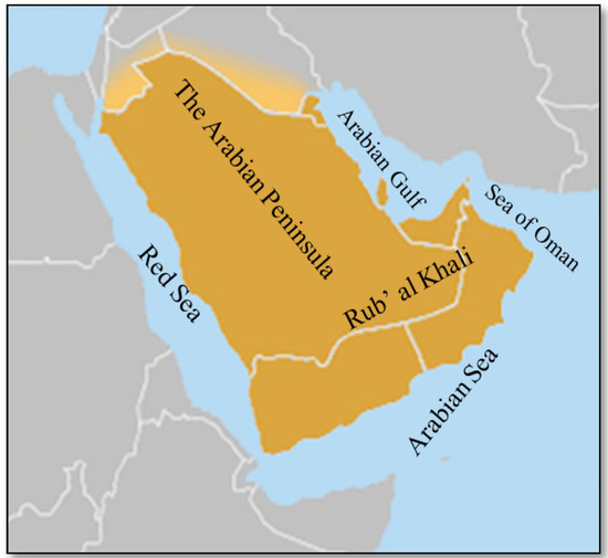 Renewable energy technologies, including photovoltaic (PV) technology, could play a significant role in supplying rising global energy demand with low environmental impacts [1]. The sun generates an abundant and unbounded energy resource but is not evenly distributed over the globe. To maximize direct normal irradiance (DNI), PV cells are preferably installed at low latitude within 30° S–30° N. For example, the Al Rub’ al Khali (The Empty Quarter) desert (21.09° N) in the Arabian Peninsula (AP) (~40° E–60° E, ~14° N–30° N), see Figure 1, and the Sahara Desert (SD) in Africa (23.4° N) receive 5.26 and 6.35 kWhm−2day−1, respectively [2]. The DESERTEC project [3] showed that the desert sun could provide the Middle East and North Africa (MENA) countries with affordable, reliable, and sustainable energy, reduce emissions and powering desalination plants to supply fresh water to the MENA countries. In Saudi Arabia, the 300 MW Sakaka IPP PV solar project is another project that represents the first-ever utility-scale renewable energy project under the National Renewable Energy Program of Saudi Arabia [4]. The plant will cover an area of six square kilometers with an investment of US $302 million. This project is the first of a series of projects under the Saudi National Renewable Energy Program, which aims to produce 9.5 GW of renewable energy by 2023.