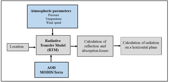For estimating the aerosol impacts on solar radiation over the AP, a spectral RTM can be applied over the area; the structure of the model is depicted in Figure 3. The RTM employs a library of radiative transfer routines and programs (i.e., libRadtran) to estimate spectral flux in the VIS and UV bands of the spectrum [33]. The RTM calculates solar radiation fluxes with a resolution of 2.5° × 2.5° under both clear- and cloudy-sky conditions. Solar radiative fluxes are computed at 118 wavelengths in the range 0.2–1.0 and 10 spectral intervals in the range 1.0–10 taking Rayleigh scattering, methane, carbon dioxide, water vapor, and ozone absorption into account [12,34,35,36]. Single-scattering albedo (SSA), absorption, scattering by aerosols and clouds at different altitudes are also considered [37].