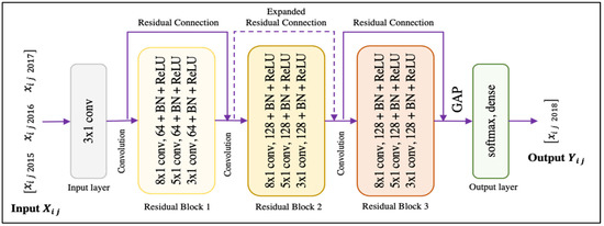 Given the success of ResNet in handling time-series problems, we adopt a ResNet model to predict solar irradiance over the AP. The model, Figure 4, follows the design decisions of earlier studies on time-series analysis [26,47]. The adopted design decisions have also been supported by the empirical results reported in a later study targeting the model sensitivity [48]. Different variants of the ResNet model have been applied to more than 100 datasets. Their study concludes that simpler models of 3 residual blocks surpass much larger models. Therefore, the model applied here has 3 residual blocks, each of which has 3 convolutional layers. The model starts with an input layer where a record will form the input to this layer. In our study, this is a convolutional layer of 3 × 1 where the input has 3 data points. Next, the output of this layer will be fed to the main building blocks of the ResNets model, i.e., the 3 blocks mentioned earlier. Each block has 3 layers of sizes 8 × 1, 5 × 1, and 3 × 1 where each filter has a length of 8, 5, and 3 for the 3 layers of each block, respectively.