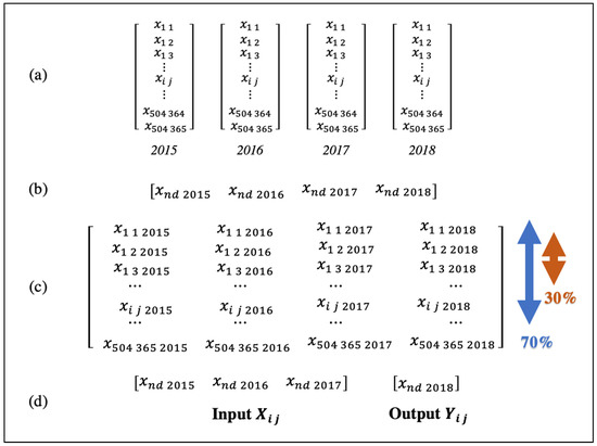 Schematic diagram of the application of the solar radiation data format for the ResNet model from 504 locations in the period 2015–2018. (a) Original time series of the 504 locations resulting in 183,960 data points per year. (b) Proposed data format, where n is the location number and d is the day of the year. (c) The final format of the data, where 70% of n locations were picked randomly for training the model and the remaining 30% of the locations for its evaluation. (d) Input and output time series.
