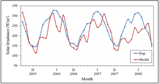 To verify the RTM model output, the results were compared with collected ground-based solar irradiance data. Due to limited ground-data availability, the model was verified with solar ground data from September 2005 to November 2008 only, at the city of Dhahran (26.30° N, 50.146° E) in eastern Saudi Arabia, Figure 7. The data were collected using 250-Watt polycrystalline (FU240-250P) PV panels. Dhahran is located in an arid/semiarid region with high-frequency dust outbreaks and low precipitation (about 80 mm y−1) during the winter and spring seasons [18]. The model showed good agreement with the in-situ measurements except during 2008, Figure 7. It can also be observed that most of the data mismatching takes place during the spring and the summer months. Anti-phase correlation between experimental and simulated solar radiation values during the winter months was also observed. This can be explained by the overestimation of dust loading in the atmosphere by the model during this period.