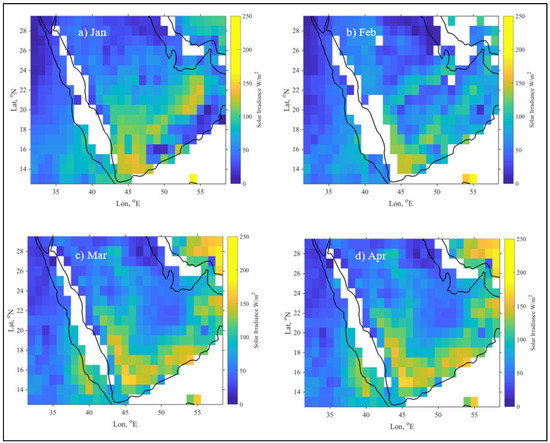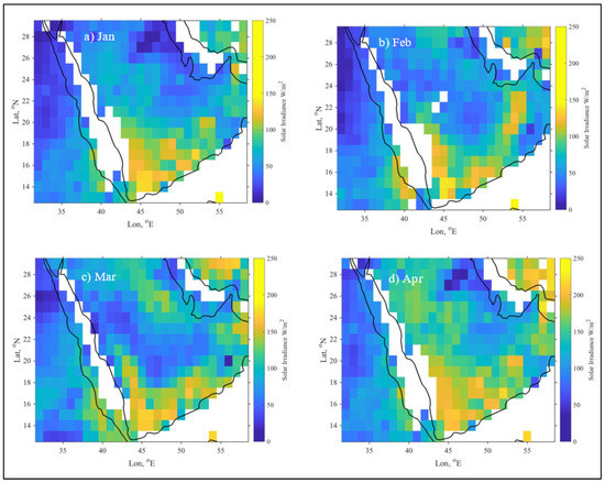 Intra-annual direct solar irradiance over AP during (a–d) January–April 2016, respectively.