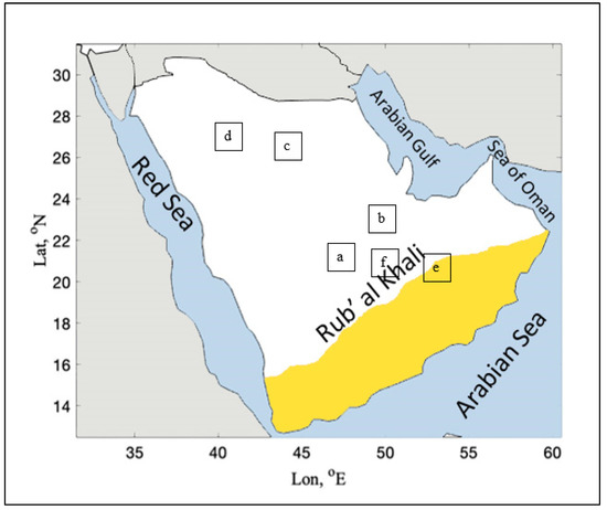 Locations with the highest solar irradiance in the Arabian Peninsula are highlighted in yellow. Points a–f represent locations used to check the efficiency of the machine learning ResNet model.