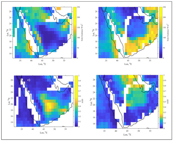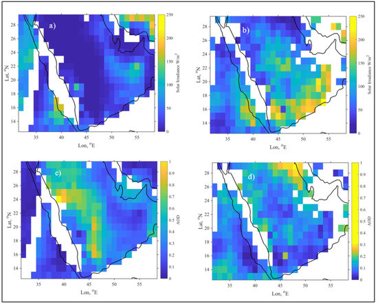 Figure 12 shows the effect of dust loading on solar irradiance during the major dust events on 27 March 2012. (Figure 12a,b show the solar irradiance, while Figure 12c,d indicate the corresponding aerosol loading.) On 20 March 2012, 1 week before the major dust event, high aerosol loading was observed over the AP, especially near the Red Sea coast, the AG, and western Iran, with corresponding lower solar radiation levels (Figure 12a,c). On the other hand, on 4 April 2012, 1 week after the storm, low aerosol concentration was observed near the Rub Al Khali desert, with corresponding high solar irradiance.