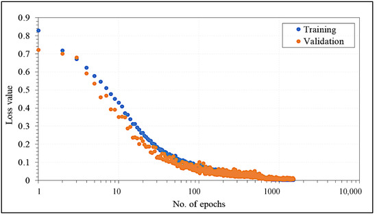 The ResNets model was trained for a relatively large number of epochs, 1500, and converged without overfitting the training data (Figure 13). Table 4 shows the performance of the model with respect to learning the pattern of data behavior where the generated results by the model were compared to the original data. This comparison shows that the model achieved high accuracy according to the performance metrics presented in Table 2. The model was able to achieve a very low MAE of ~0.02, MSE of ~0.005, and R2 of ~0.99. This applies to both the 504 locations scenario and the 126 locations scenario of solar irradiation arrays. There is a slight difference in R2 in the range of [0.001–0.002], between the two scenarios. The first scenario required more pre-processing, as we averaged the solar irradiance data for every 4 adjacent locations, where each location is represented by 1° × 1°. Since the results tend to be slightly higher at the second scenario, the first scenario with 504 locations was used while preparing the training dataset of the model, as it encourages less computational time.