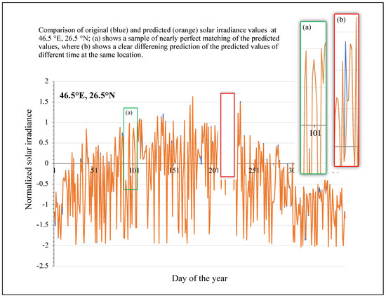 Comparison of original (blue) and predicted (orange) at (a) 47.5° E, 20.5° N; (b) 50.5° E, 22.5° N.