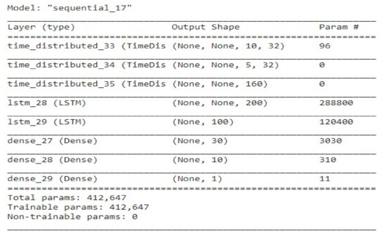 The last hybrid experiment is ConvLSTM, shown in Figure 6 with three layers. The first layer is a ConvLSTM with 64 filters; the second is a flatten layer and the third and final layer is a dense layer at the output. The model is trained for 100 epochs with a learning rate of .