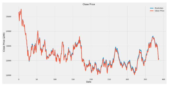 The stacked and bidirectional LSTM shows a significant improvement in RMSE compared to Experiment 2.1, with a final RMSE of 132.77 and 167.87. On the other hand, the hybrid models returned mixed results. The CNNxLSTM model Figure 8 saw an increase in RMSE, which resulted in impaired performance compared to experiment 2.1 in predicting the closing price. The ConvLSTM shows an improvement in prediction performance compared to the first experiment.