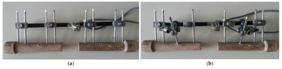 Quarter-bride configurations were composed from active and compensation strain gauges, as shown in Figure 7. Active strain gauges were applied on the opposite sides of the frame, i.e., MM- and MM+ control zones (Figure 7). This way their longitudinal axis matched the direction of the maximal principal strain.