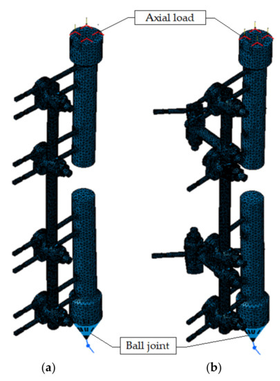FEM model of the Sarafix device; (a) B50 configuration, (b) C50 configuration.