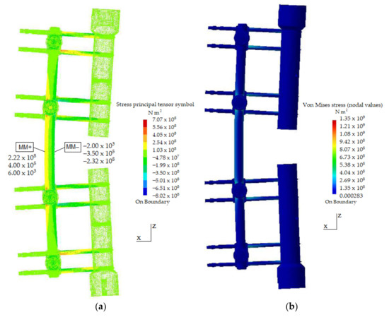 Apart from the displacement determination, complete structural analysis requires an insight of the principal stresses in characteristic zones of the fixation device [27,28]. Structural and experimental analysis requires monitoring of intensities and the directions of the principal stresses in the two control zones of the device construction. Control zones are located at the closer side to the bone (MM−) and opposite side (MM+), as shown in Figure 5.