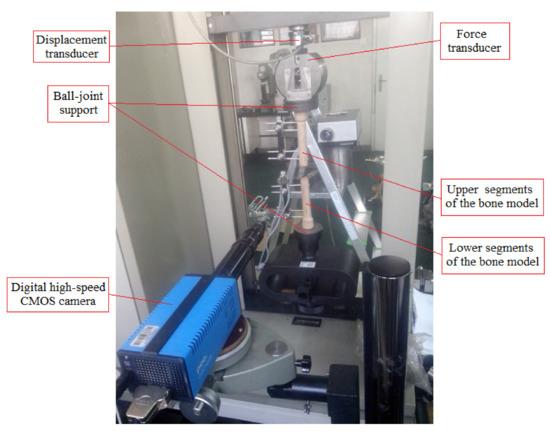 Supporting of the ends for the upper and lower bone models was carried out with spherical joints mounted on the force transducer and lower side-tools. One of the side-tools was fixated to the base of the testing machine. Its upper part contained the spherical joint, which “grabbed” the lower bone model segment. The upper mobile side-tool also contained a spherical joint, which was connected with the force transducer.