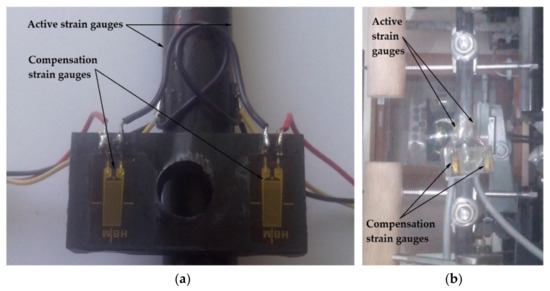 Compensation gauges are used to compensate the temperature effects, and they are the same type as the active gauges. Compensation gauges were mounted on a plate that was connected to the frame in an area near the control zones. The plate and fixation device frame were made out of the same material. After their application, all of the gauges were protected from the mechanical defects using the sealing tape.