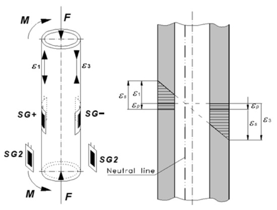 The fixation device frame, due to axial pressure load, was exposed to the eccentric pressure. This caused the specific principal strain condition, which is formed by bending strains and axial pressure strains (Figure 8). Using the superposition method, these strains can be defined as: