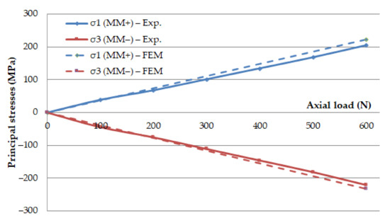 The diagram shows great correspondence of the result obtained with two methods, with maximum variance of 7%. Similarly, a comparative diagram for the principal stresses σ1 and σ3, for the control zones MM+ and MM−, respectively, is formed for the C50 fixation device configuration, as shown in Figure 10. Figure 10 shows great correspondence of the result, with maximum variance of the 4.9%.