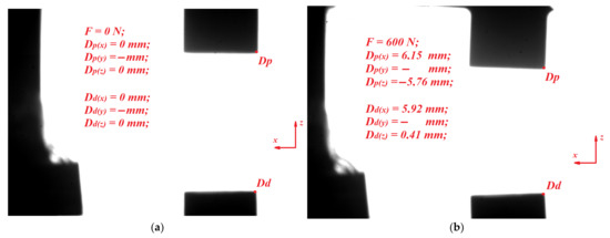 Displacement at the site of fracture; (a) F = 0 N, (b) F = 600 N.