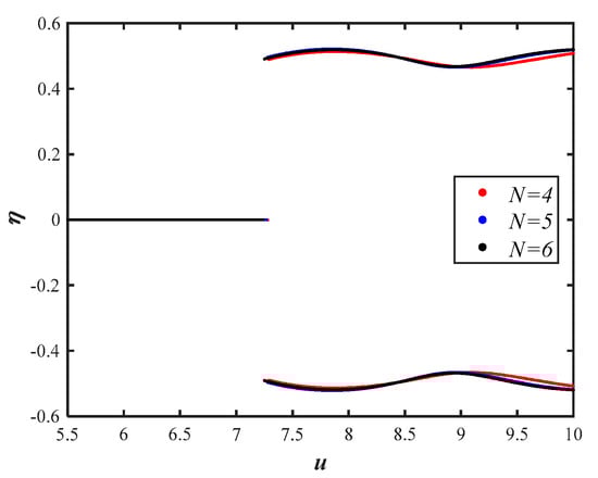 In order to observe the effect of dry friction on the stability of the system more conveniently, the gravity is ignored in the following analysis. The key system parameters are chosen to be: α = 0.001, β = 0.213, γ = 0, fn = 0.3, and ξd = 0.5. The modal truncation number N is chosen as 4, 5 or 6. The bifurcation diagrams of the tip-end responses of the pipe with different modal numbers are given in Figure 3. It is seen that, when N is given different values, the three bifurcation diagrams are very similar, showing that the results of N = 4 are acceptable. In addition, when the dry friction was installed at several typical positions, several other bifurcation diagrams for the pipe’s responses have been obtained by taking more extensive calculations. Again, it was found that the utilization of N = 4 is reliable for predicting the dynamic responses of the pipe. Due to the similarity of these additional bifurcation diagrams, the corresponding results will not be given here. To reduce calculations, therefore, we will take N = 4 in all of the following calculations.