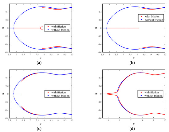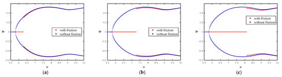 It is seen from Figure 4 that the dimensionless critical flow velocity of the pipe for flutter instability is about 5.78 without dry friction. When the applied dry friction force is 0.1, as shown in Figure 4a, the critical flow velocity of the pipe system will increase to 6.29. Moreover, the dry friction has almost no effect on the vibration amplitude of the pipe when the pipe system becomes unstable. It is also seen that, when the flow velocity is slightly higher than the critical value, the displacement amplitude at the end of the pipe has a jump with a discontinuous change, which may be related to the applied dry friction force because the expression of the dry friction force is a discontinuous function in mathematical form. When the direction of the lateral velocity at ξd changes sign, the sign of the friction force will become opposite, and thus, a jump change in the bifurcation diagram occurs.