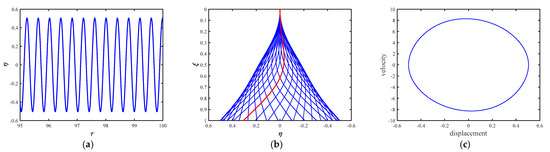 When the flow velocity in the pipe exceeds the critical value, the pipe would produce relatively large-amplitude vibration. Figure 5 shows the time history curve, oscillation shapes, and phase portrait of the response of the pipe when the flow velocity is 7.5 under the condition defined in Figure 4b. It can be seen from Figure 5a that the vibration of the pipe is steady in this case, and the amplitude is about 0.5. Figure 5b shows the oscillation shapes of the cantilevered pipe at this flow velocity, indicating that the response of the pipe mainly contains the first- and second-mode components of a cantilevered beam. The phase diagram given in Figure 5c shows that the pipe vibrates in the form of a limit cycle motion.