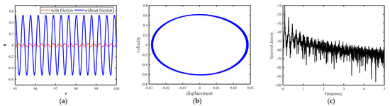 In order to better observe the dynamical behavior of the pipe after flutter instability, we further calculated the time history curve of the pipe with ξd = 0.3 and u = 7.8, as shown in Figure 7a. It is noted that the pipe vibrates periodically, but the vibration amplitude of the pipe with the dry friction constraint is much smaller than that of the pipe without dry friction, again, showing that the application of dry friction restraint can suppress the vibration of the pipe. The phase portrait and power spectral density (PSD) curve of the pipe with dry friction at this flow velocity are given in Figure 7b and Figure 7c, respectively. The phase portrait is shown as an ellipse-like shape. It is noted that the phase portrait of Figure 7b is not a strictly periodic motion. This is because that the maximum displacements of the pipe in this case might fluctuate slightly, resulting in a relatively disordered PSD curve. However, since the fluctuation of the displacement of the pipe is relatively small, the pipe may be still considered to be in a periodic-like motion.