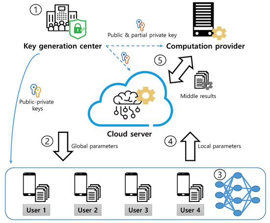 As shown in step ① of Figure 2, individual public-private key pairs (, ) for are generated at the KGC and are sent to clients for encryption and decryption through secure channels, where is the number of clients participating in the training process of the proposed system. Before the KGC distributes the key pairs, it performs an authentication procedure for the clients and delivers the public-private key pairs to authenticated clients. The clients’ public keys for encryption and a list of authenticated clients are transmitted to the CS and the CP, and the CS utilizes only local model parameters from authenticated clients. In addition, the partially private keys generated by the KGC are only sent to the CS and the CPs through secure channels for cooperative decryption, respectively.