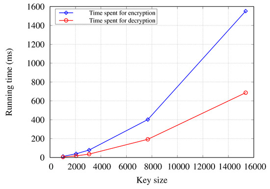 Figure 4 shows the running time measured for performing encryption and decryption according to the key size. In our simulation environment, the key sizes were selected as 1024, 2048, 3072, 7680, and 15,360 bits to achieve 80, 112, 128, 192, and 256-bit security levels, respectively. For example, the encryption took 11.7, 78.4, and 1552.5 ms for 80, 128, and 265 bit security, respectively, in Figure 4. As the key size increases, the running times for encryption and decryption increase exponentially because the exponent of the exponentiation operation in encryption and decryption increases.