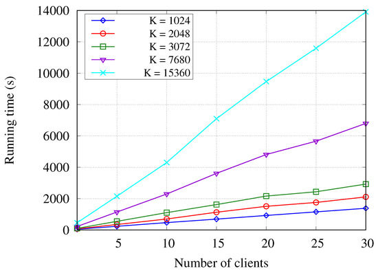 Figure 5 shows the running times measured for performing the proposed secure averaging local model algorithm in Algorithm 1 with respect to the number of clients in the cryptosystem with different key sizes. The convolutional neural network with 105,506 parameters was used for the simulation study, and the data length used for representing weights was set to 16 bits. As the number of clients increases, the number of homomorphic operations increases as the number of parameters to protect using the HE scheme increases, and thus the running time increases linearly. In Figure 5, the running time increases as the key size increases. In fact, if the key size is larger, the total number of ciphertexts to be delivered is smaller. However, as shown in Figure 4, the running time of homomorphic operations increases exponentially as the key size increases. As a result, the total running time of Algorithm 1 increases as the key size increases. Nevertheless, as the key size increases, the security level of the system increases. This is because the higher the key size, the greater the number of cases is required to break the cryptosystem. Thus, because the computational burden and security gain have a trade-off relationship, we can select an appropriate key size according to system requirements.