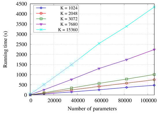 Figure 6 shows the running time for performing the proposed algorithm with respect to the neural network size of the federated learning. The number of clients was set to 10, and the data length used for representing weights was set to 16 bits for the simulation study. As the number of parameters increases, the running time increases because the amount of information to be processed by the homomorphic operation increases.