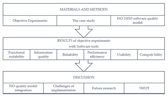 Firstly, this paper will describe the materials and methods used for the research—Including objective experiments and the ISO 25010 software quality model, which was adjusted for the evaluation of climate adaptation software tools. Secondly, the results of objective experiments with five different software tools, evaluating their functional suitability, reliability, performance efficiency, operability, compatibility and information quality, will be described. Lastly, the results of the research will be summarised, discussing the integration of the ISO quality model, challenges in implementing climate adaptation software tools, future research and a SWOT analysis. Figure 1 presents the structure of this paper.